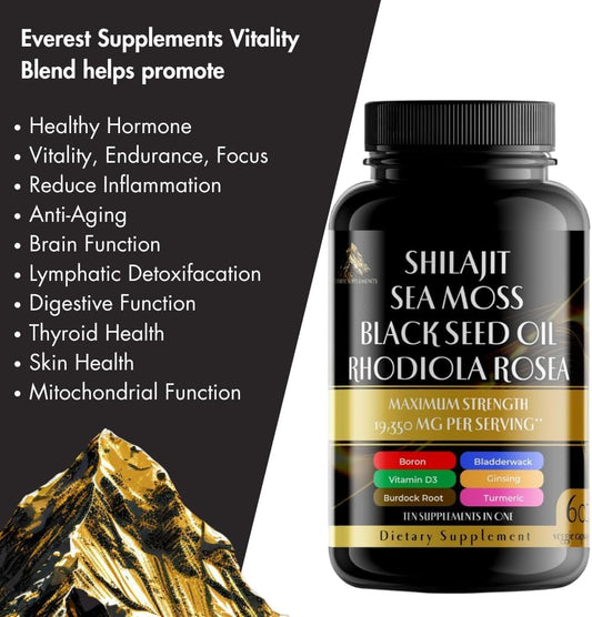 Earth's Vitality Blend | Shilajit Pure Himalayan 9000MG, Energy Booster Sea Moss 2000MG, Rhodiola Rosea 1000MG, Black Seed Oil, Bladderwrack, Ginseng, Turmeric, Burdock Root 500MG